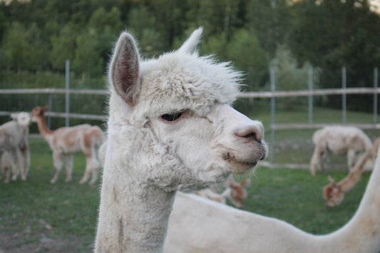 Chandail en alpaga gris avec col rond, motifs alpagas