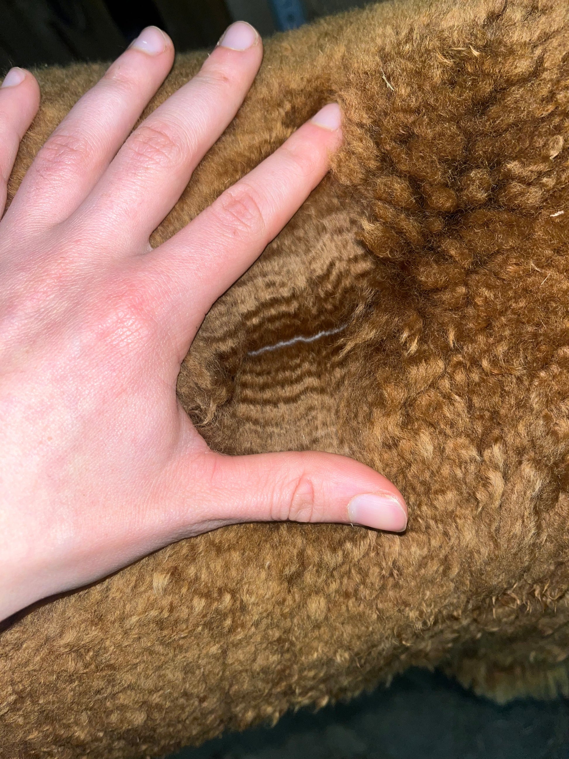 Australia's fleece is very lustrous and dense. It's silky to the touch, indicating good finesse. We would like it to have a little more crimp, she will have to be bred accordingly when she reaches maturity.