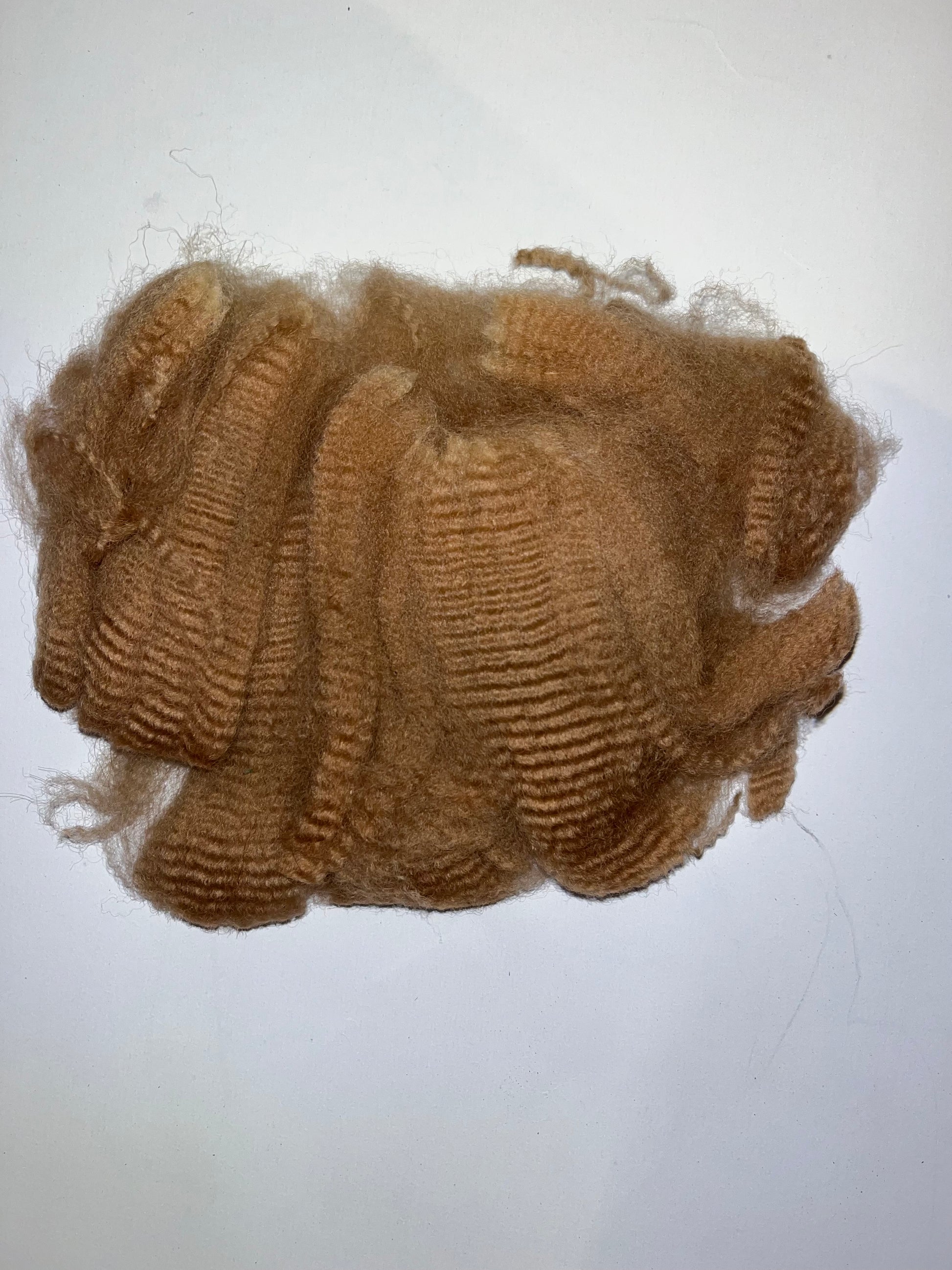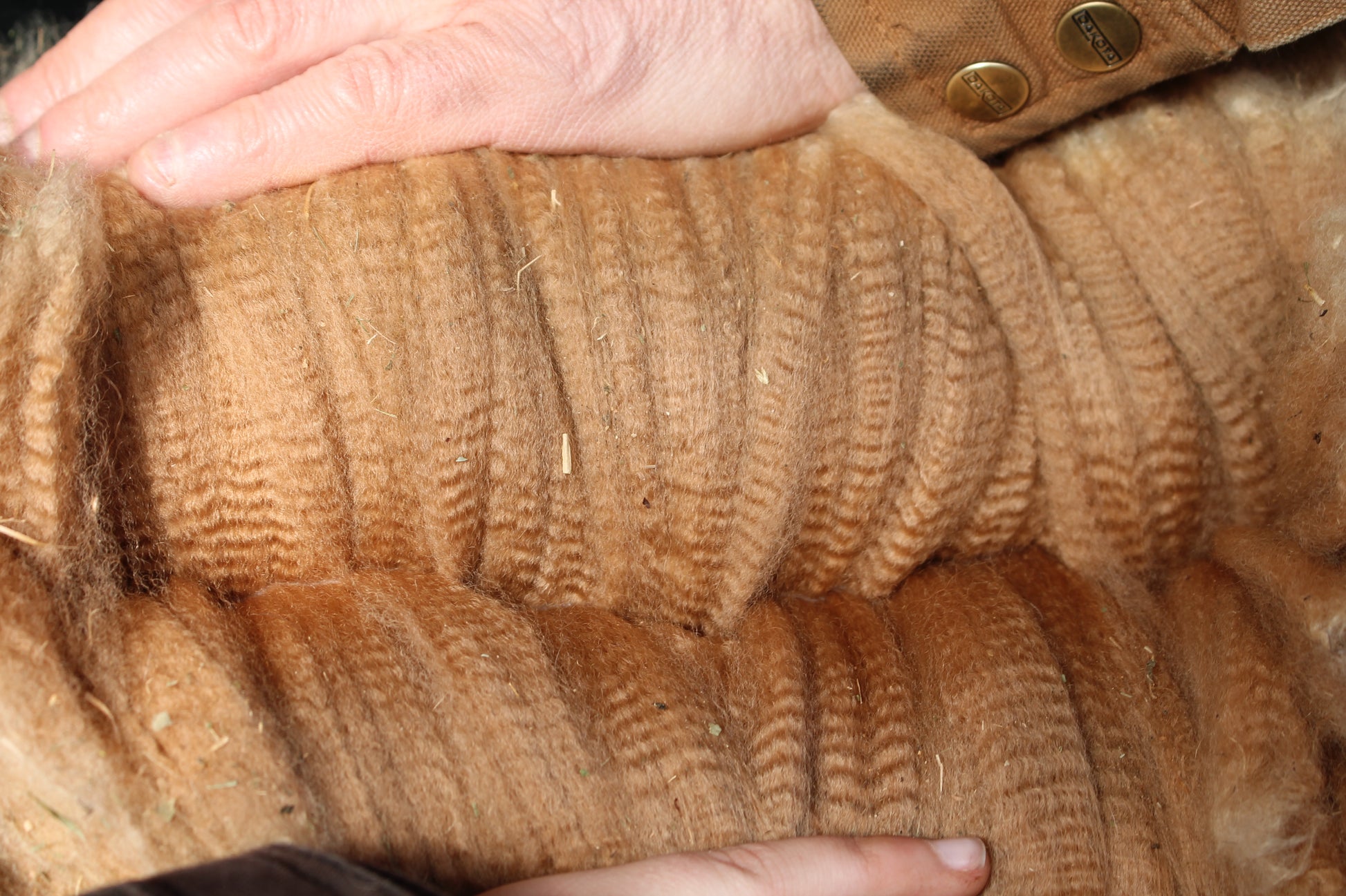 Sa conformation est excellente; elle est d’une bonne stature compacte et possède une jolie tête, similaire à celles de ses parents. Sa toison a suivi une courbe de développement plus tardive et il a fallu attendre plus d’un an avant de voir son plein potentiel. Son crimp est bien défini et sa toison a une belle brillance. Grâce à sa densité et à la longueur de sa fibre, Aloha Sunshine tond annuellement une toison parmi nos plus lourde.
