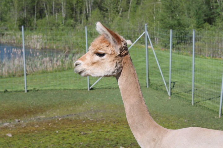 Elle est très grande! Son museau est un peu long et dégarni, mais nous sommes capables d’améliorer l’apparence du visage chez plusieurs de ses crias, Appy et Auriflamme par exemple.